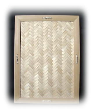 上記21の「趣味の卓上和額」と同じ構造で、B5サイズの作品を、磨き竹(表皮を削り取った竹)のしっとりとた質感の四辺の縁と、身竹のあじろ編みで上品に表現します。また皮を取り除いた籐で四辺の縁を虫の字に止め、和風の味わいをそれとなく醸します。