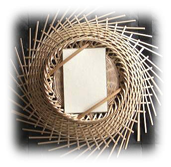 こちらも竹工芸の装飾性を強めに表現した作品です。片締め編みの躍動的な動きは、個性の強い作品とのコラボで、強い存在感を表現します。中心部の作品ははがきサイズの色紙を半割りの丸籐で押さえており、薄手のハガキはやや不向きと思われます。