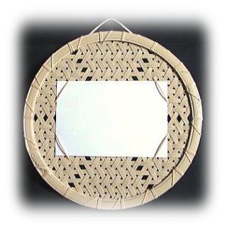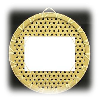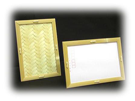 はがきサイズの作品を、磨き竹(表皮を削り取った竹)のしっとりとた質感の縁と、身竹のあじろ編みで上品に表現しています。また、皮を取り除いた籐で四辺の縁を虫の字に止め、和風の味わいをそれとなく醸します。