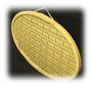 美しいゴザ目模様の一部に飛びゴザ目の模様を加えることで、縞模様のアクセントを加えました。編み生地の周囲の柾は、竹の張力が生んだ自然な楕円のカーブが美しい作品です。