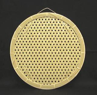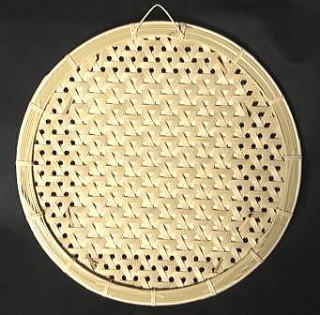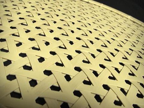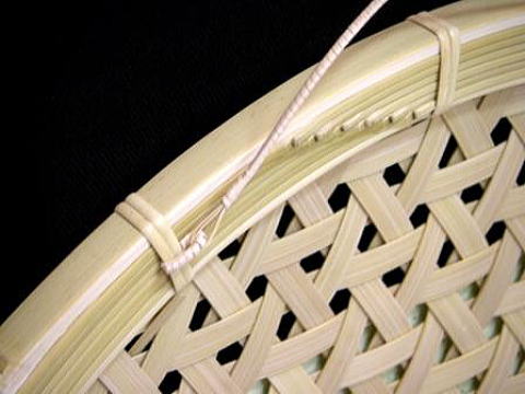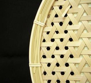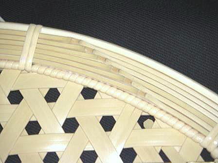 編み生地は、幅8.5o厚さ1.1oの竹ヒゴ72本を2枚剥ぎにして柔軟性を持たせ、整然とした亀甲模様に仕上げています。写真だけではよくわかりませんが、この幅と厚みのヒゴをこの編み模様に仕上げるには、結構爪の痛くなる作業の連続です。