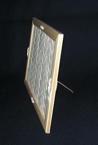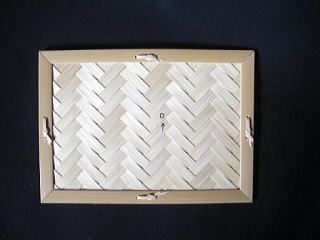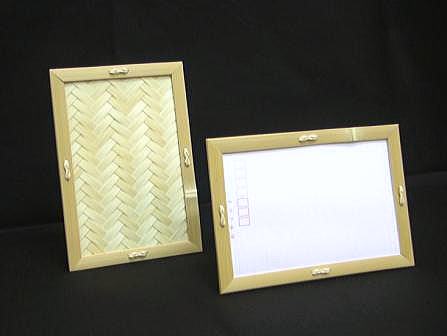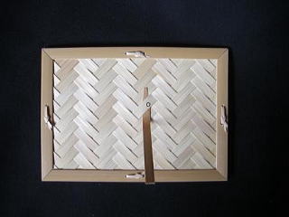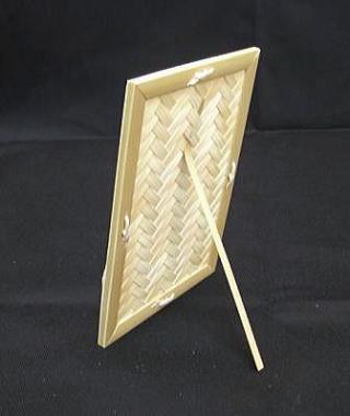 はがきサイズの作品を、磨き竹(表皮を削り取った竹)のしっとりした質感の縁と、身竹のあじろ編みで上品に表現しています。また、皮を取り除いた籐で四辺の縁を虫の字に止め、和風の味わいをそれとなく醸します。
