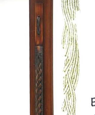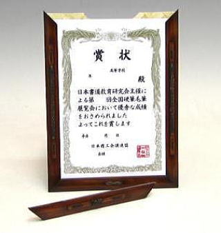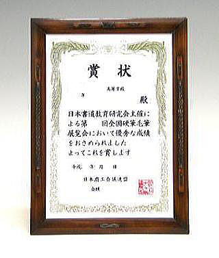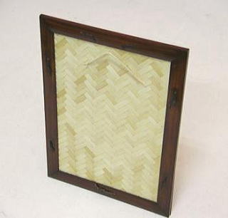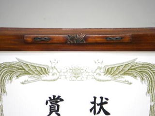 41のB5和額と同じ構造ですが、A4サイズとなれば四辺の竹縁も長くなり、虫の字留めだけではアクセントとして弱いので、上縁と左右の縁を伝統工芸の籐飾りに変えました。またこれに染色を加えて、伝統工芸色の強い作品に仕上げました。見本写真は賞状ですが、様々な利用が可能です(作品の厚さは2oまで可能です)。